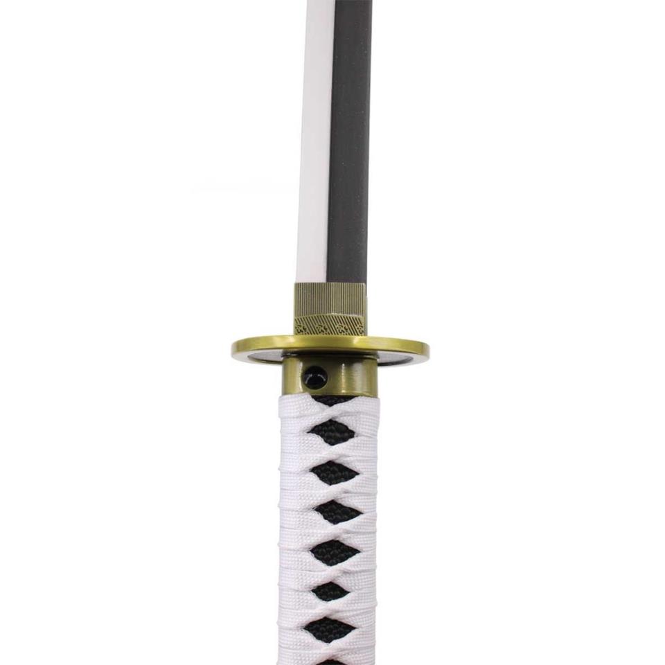 La vaina presenta un diseño sencillo pero elegante, fabricada en madera con un acabado en un hermoso color blanco. Complementada con una delicada cinta blanca en la parte superior y detalles decorativos dorados, realza la estética general de la katana, dándole un aspecto sobrio y sofisticado.