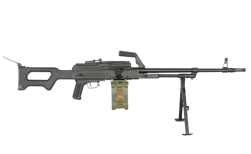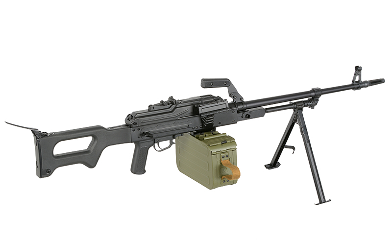 La réplica de la ametralladora eléctrica PKM está sólidamente construida a partir de una combinación de elementos metálicos y acero . Piezas como el bloque de gases ajustable, la montura del bípode, la manija del cañón, la cubierta del cerrojo, el cuerpo, el retén del cargador y la culata están hechas de acero. Elementos como el dispositivo de bocacha, la mira frontal, el cañón exterior, el bloque de gases, el tubo de gases, el bloque de bloqueo, el ensamblaje del cañón, el ensamblaje del gatillo, el alimentador de munición, la manija de carga y el seguro están hechos de metal de alta calidad. La empuñadura de pistola, la culata y el guardamanos están hechos de plástico duradero.