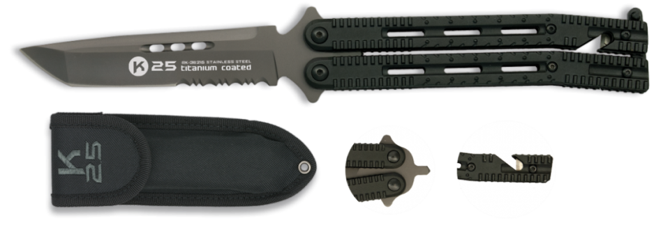 - Material de la hoja: Acero inoxidable con recubrimiento de titanio y acabado camo ARMY ESP.
