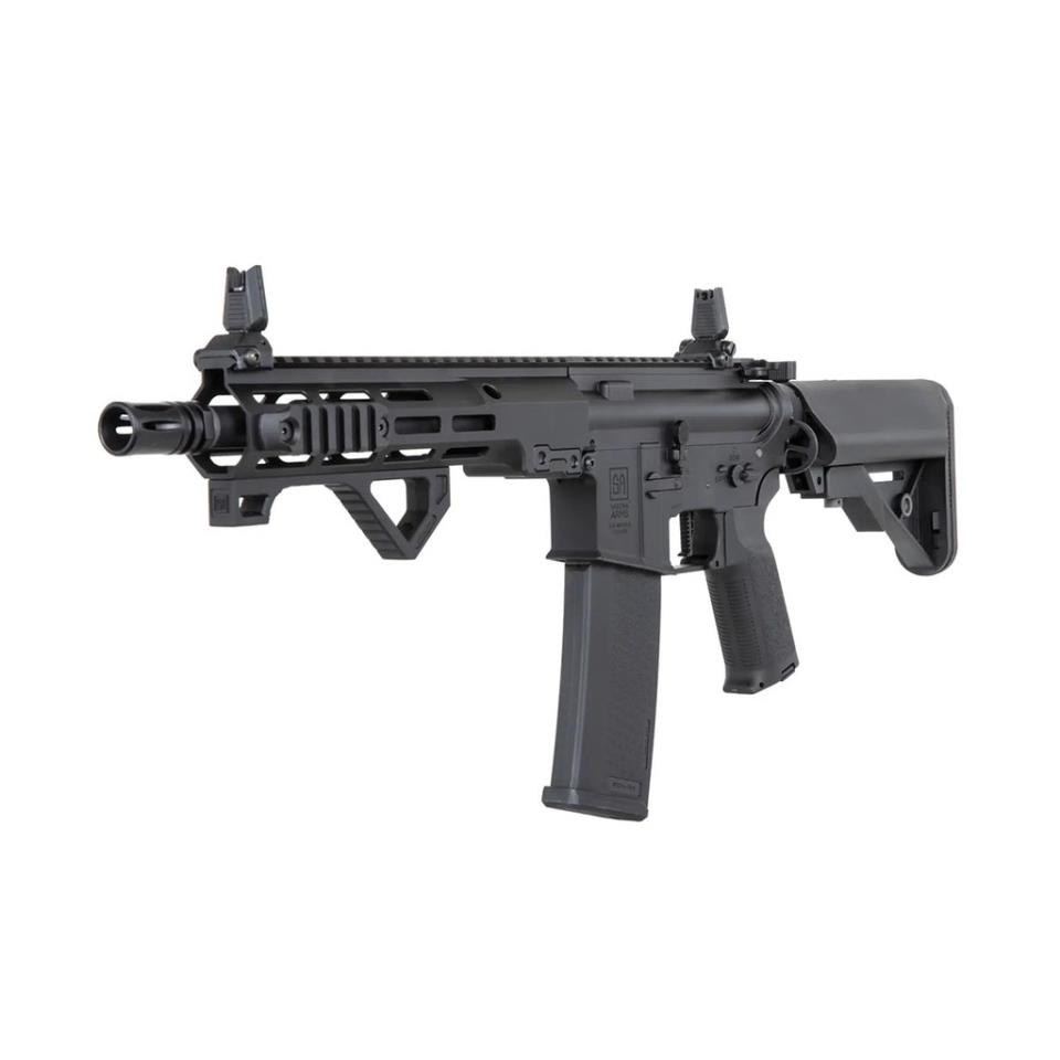 El nuevo fusil PRIME SA-P23 Aster II de Specna Arms destaca por su llamativo diseño inspirado en los legendarios fusiles Colt concretamente en los modelos de tipo AR15 muy populares en el mercado civil de los Estados Unidos, el guardamano es de tipo M-Lok, y se caracteriza por tener un diseño mucho más ligero y delgado permitiendo un agarre mucho más cómodo y una mejor movilidad para el operador con respecto a los clásicos guardamanos de tipo M4, por otro lado gracias a su diseño podremos instalar tanto accesorios de tipo M-Lok como segmentos de raíles Picatinny en las posiciones y ubicaciones que más nos convengan, otorgándonos la posibilidad de instalar una amplia variedad de accesorios como grips, linternas, láseres o incluso sistemas AM/PEQ. El cuerpo dispone de un diseño muy robusto y solido acompañado de una empuñadura diseñada especialmente para proporcionar la máxima ergonomía posible, está a su vez dispone de una superficie antideslizante que nos brinda un agarre mucho más firme y cómodo. Por último la culata de tipo crane es ajustable en múltiples posiciones y a la vez que nos brinda una amplia capacidad de almacenamiento permitiéndonos usar una gran variedad de baterías.